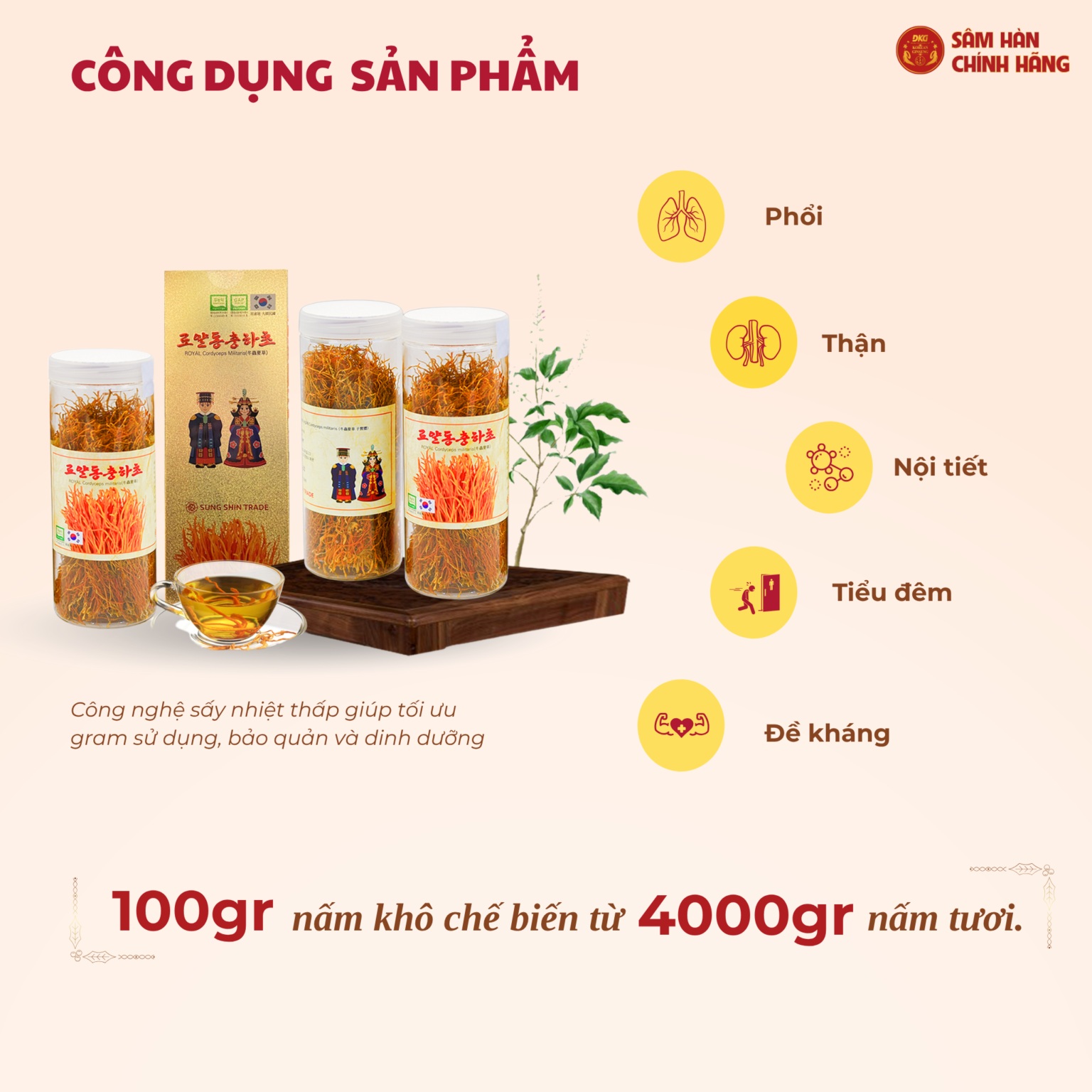 2. Thành phần: Đông trùng hạ thảo hữu cơ sấy khô (Xuất xứ Hàn Quốc) 100%.